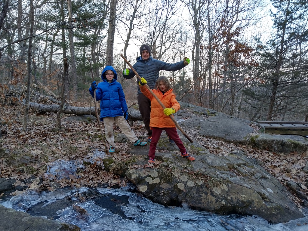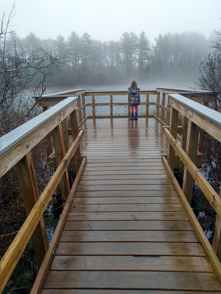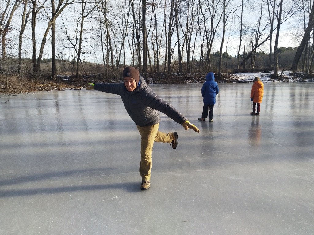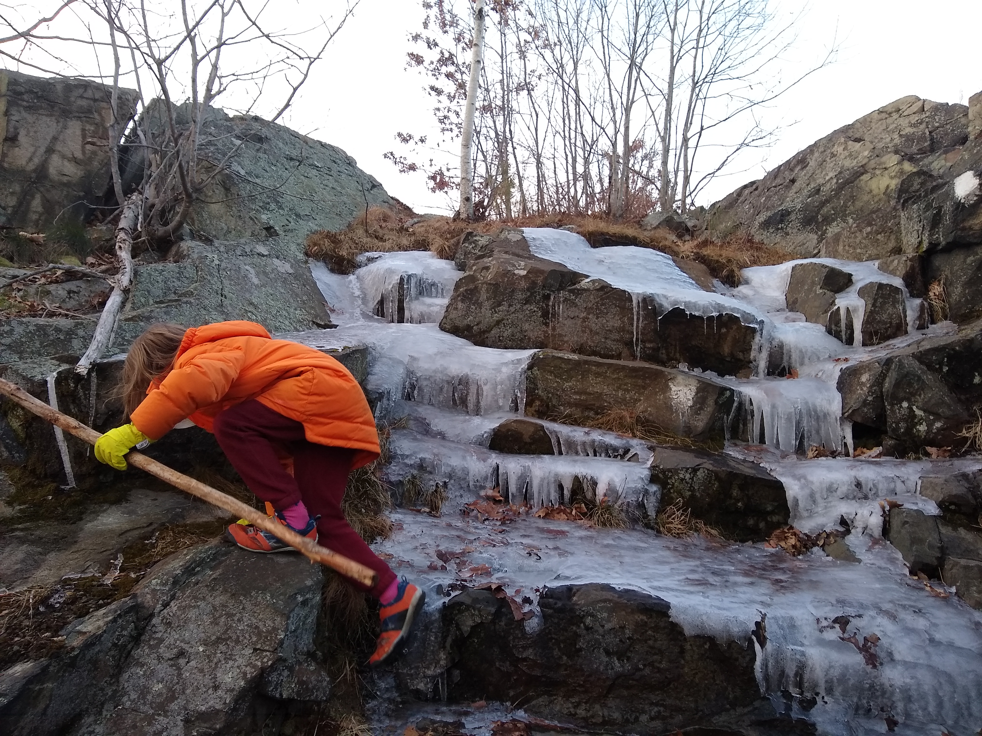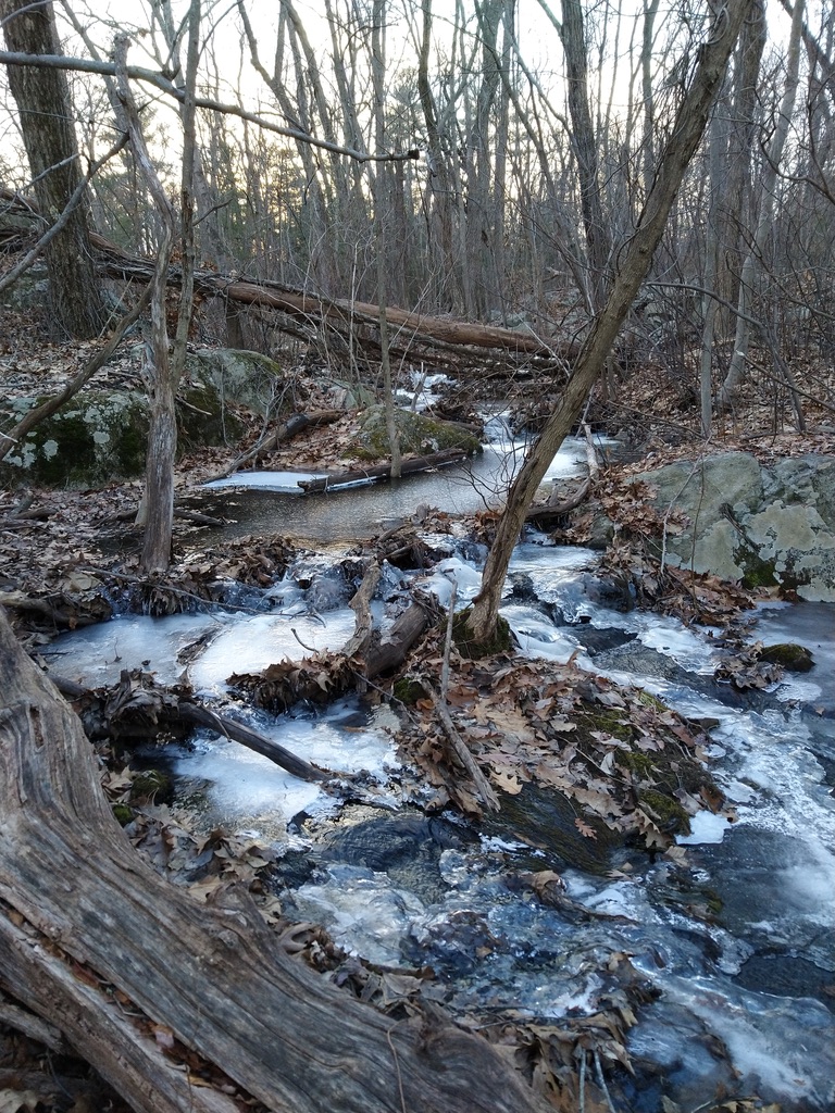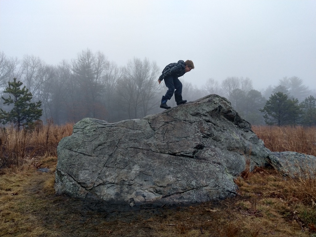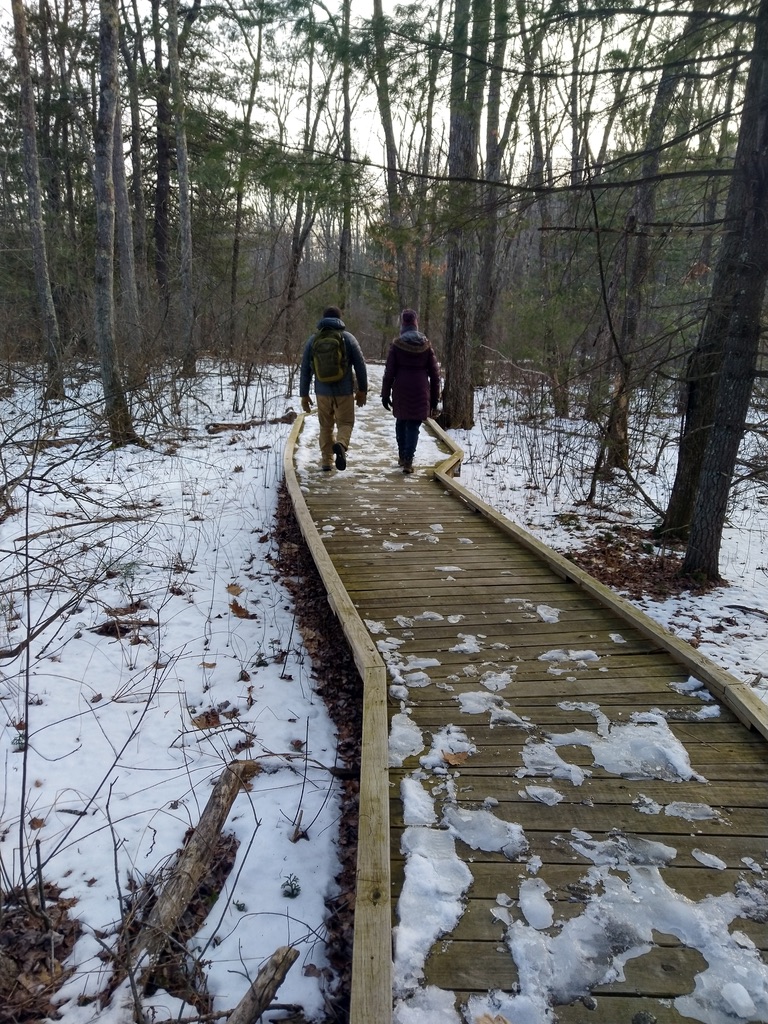 Jonah: We really needed to get out of the house some time on the weekend, and a few hours break in the weather, along with a convenient errand to Wayland, were all the excuse we needed. The Weir Hill loop featured a lot of wood-and-earthen staircases, plus a frozen kettlehole pond which offered a great opportunity for silliness sliding around. We enjoyed the boardwalks, which took us across the road towards Round Hill, but it was getting cold and dark, so we decided to leave that for another day. Better to leave while the leavin's good.