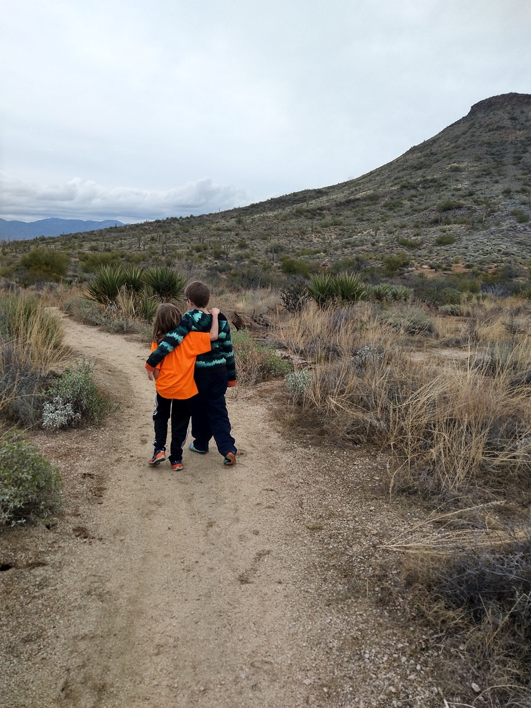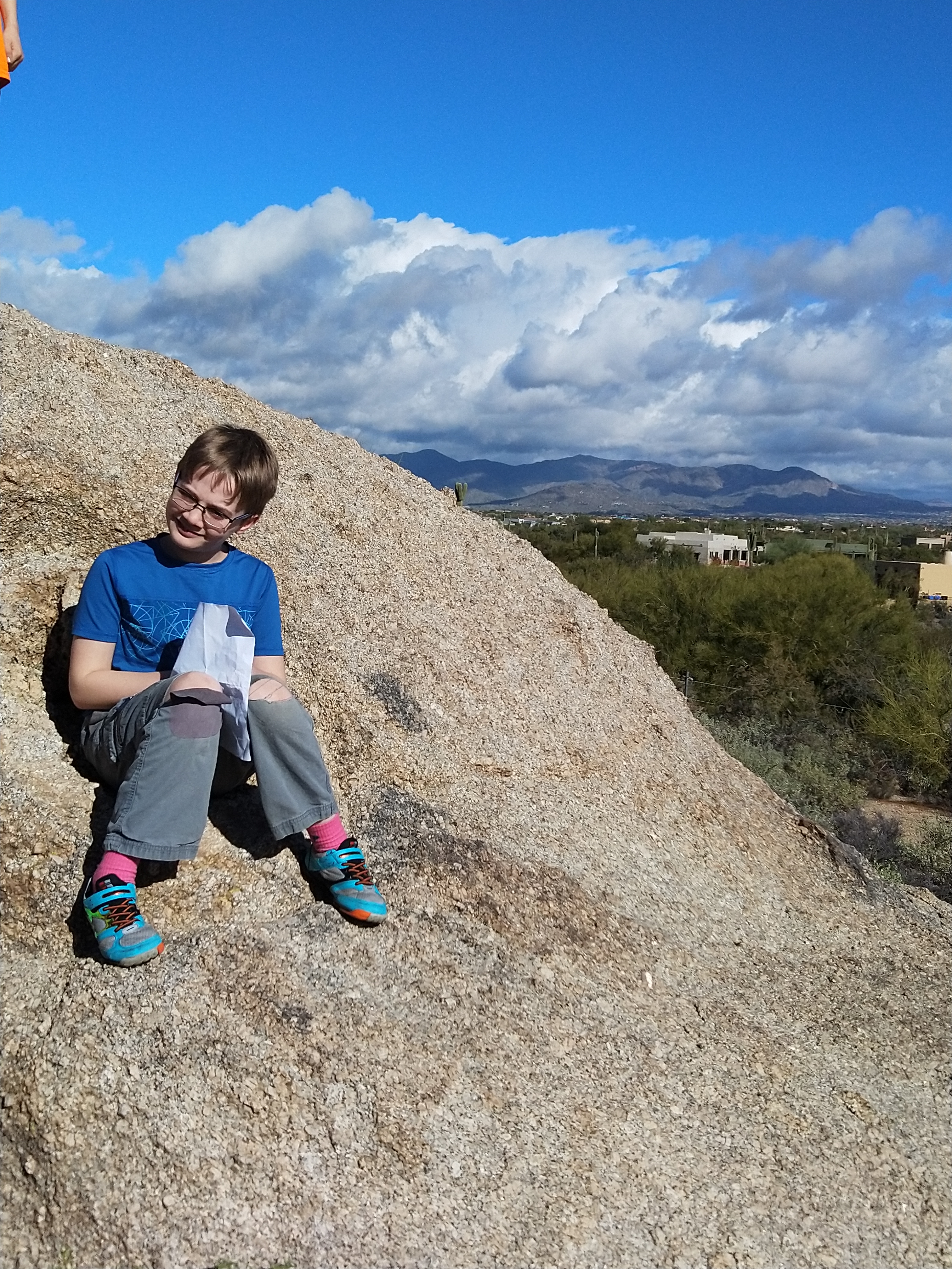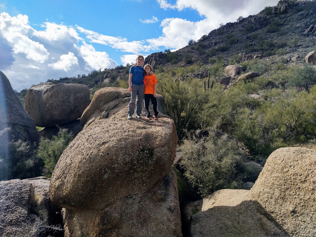Courtney: This was our first time to the McDowell Sonoran Conservancy, and we chose the only trail that went to a summit. We wound our way around the back of the mountain, and then over the peak at the end. There were a number of other hikers and mountain bikers, but it didn't feel crowded; we were often alone. And everyone seemed to be in a friendly mood. We took a picture for a couple who was there with their dogs. The chollas are thriving on this trail, and there are also patches of dry grasses. Kai spotted a tarantula hawk wasp, an impressively huge insect with bright orange wings. Jonah noticed a half-mile loop near the trailhead that is billed as 'accessible' and might be a nice whole-group activity at some point!