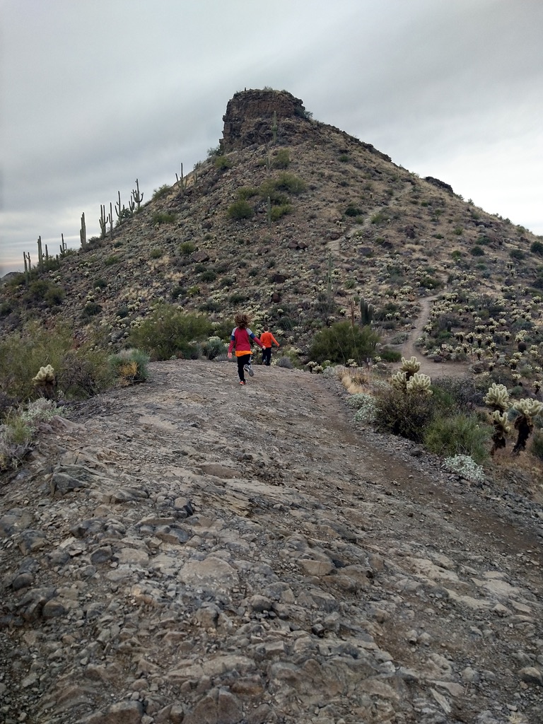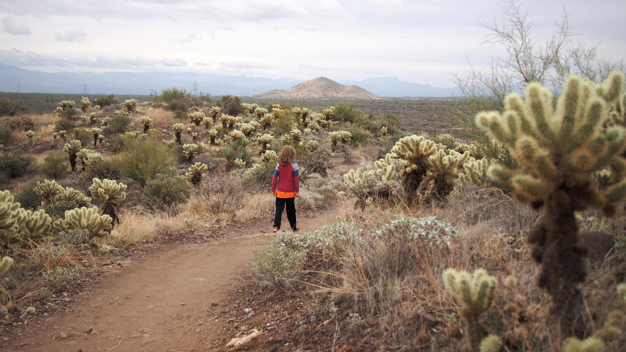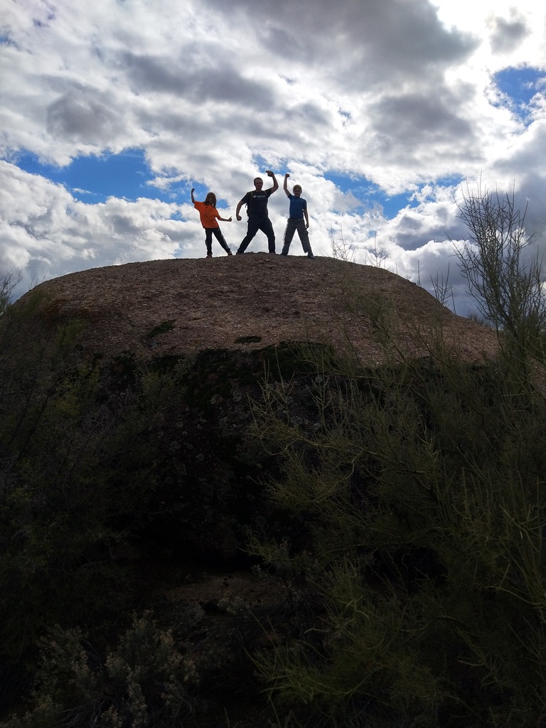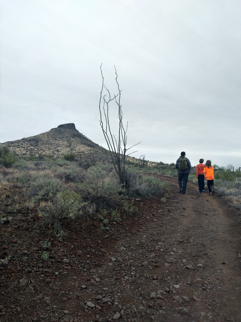 Courtney: This was our first time to the McDowell Sonoran Conservancy, and we chose the only trail that went to a summit. We wound our way around the back of the mountain, and then over the peak at the end. There were a number of other hikers and mountain bikers, but it didn't feel crowded; we were often alone. And everyone seemed to be in a friendly mood. We took a picture for a couple who was there with their dogs. The chollas are thriving on this trail, and there are also patches of dry grasses. Kai spotted a tarantula hawk wasp, an impressively huge insect with bright orange wings. Jonah noticed a half-mile loop near the trailhead that is billed as 'accessible' and might be a nice whole-group activity at some point!