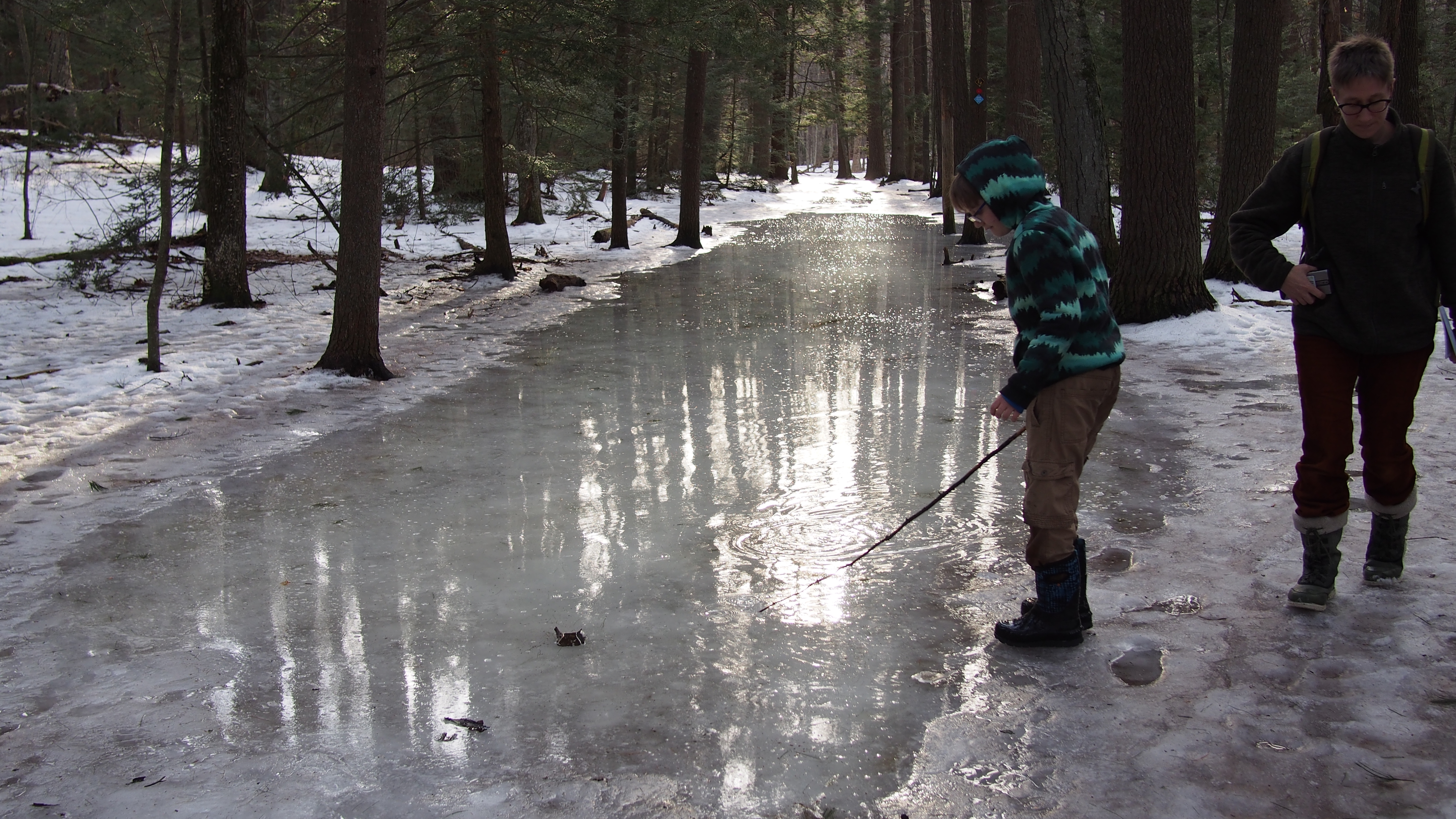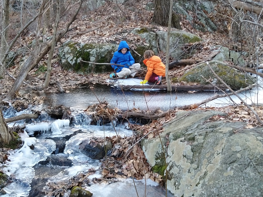 Courtney: We were looking for a short one on this freezing cold day, and found this trail, which was very near Wayland/Lincoln. Arlene, Bill, Camie, Michael, and Zoe were able to join us. Driving on the way to the trail, we passed Walden Pond and noticed people skating and shoe-sliding out on the ice. The kids were interested in stopping, but we kept going since we were meeting people for the hike. It was a pleasant surprise to find a little pond just off the parking area, completely frozen over and perfect for sliding around! We played there before and after hiking the short loop around Weir Hill.