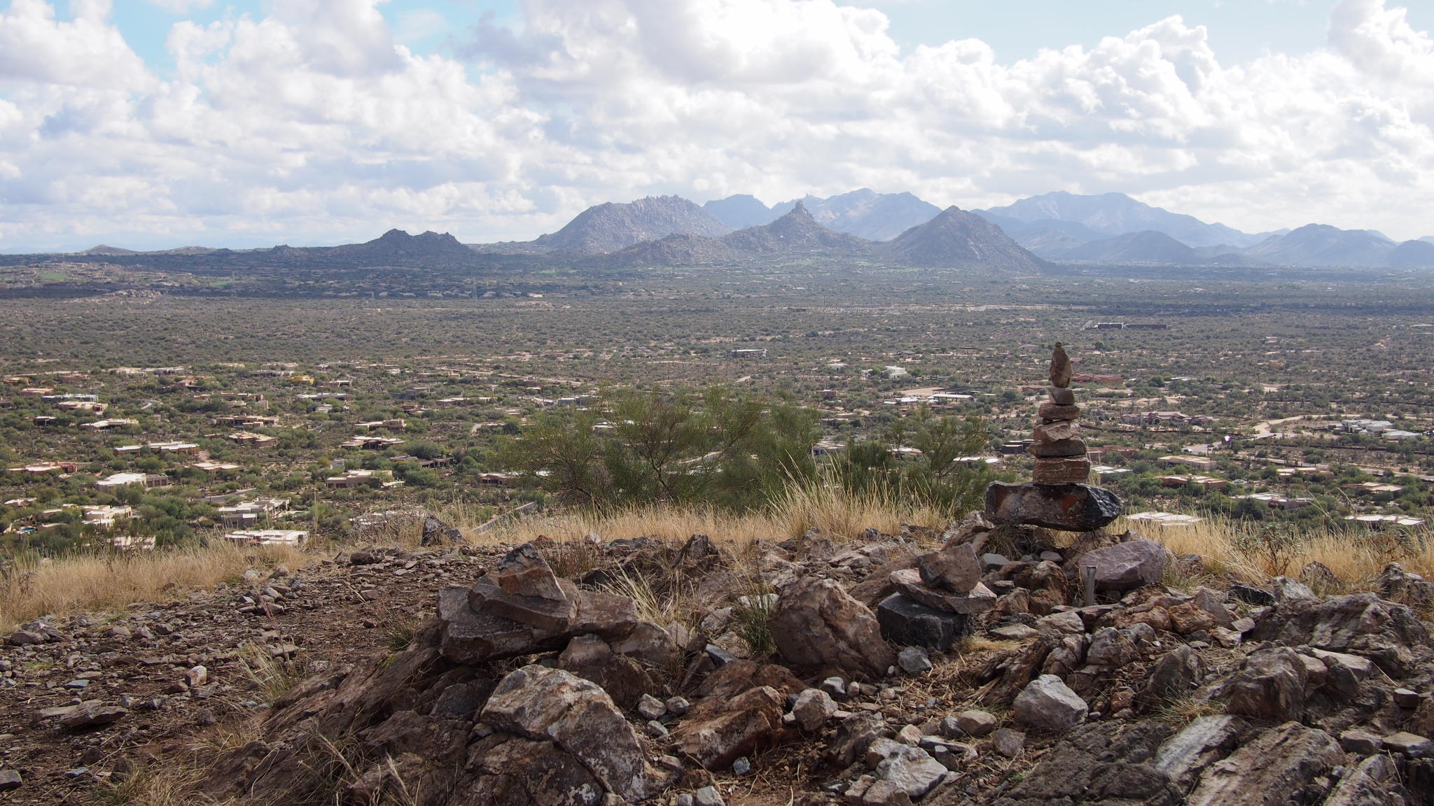 Courtney: We kept up the tradition of a Lone Mountain hike while visiting my parents. No one fell in a cactus this time! We variously scooted and walked to the trailhead with my family, and then the four of us took off for the mountain. We reached the peak quickly, and I was struck by how that has changed over the years! We added some stones to the cairn at the top. We spotted my parents' house and waved to them and to Ian, who were looking through the telescope in the back yard. On the way down, we clambered around some rocks and found a very fragrant plant which turned out to be desert lavender, and reminds me of something I haven't placed yet - sunscreen, or some kind of lotion, maybe.